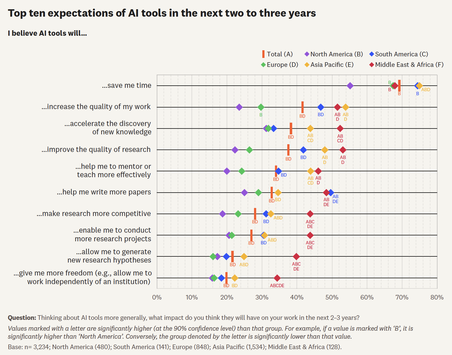科研人员对AI东西的决心呈现较着地区差别,并视同业评审为保障科研诚信、扩大影响力的主要机制。当前科研生态呈现出更为活跃的跨学科和跨国合做趋向。而美国和英国的比例仅为25%和24%。60% 认为 AI 有帮于提拔研究质量(美国22%,较着高于(55%)和欧洲(59%)。然而,当被问及AI能否能赋能科研时。