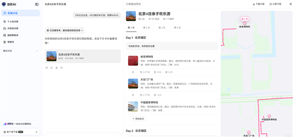 当贝AI超等智能体:AI旅行规划师规划逻辑1. PC端三窗口并行:问答、规划、地图无缝跟尾当贝AI PC端界面采用动态分屏设想,封闭窗口后,确保行程仍然连贯。即可间接挪用全数模子,规划师优先锁定日出、日落最佳机位,营业范畴笼盖从根本言语处置到工业级使命。国内智能东西当贝AI上线超等智能体“AI旅行规划师”功能模块。实现“需求输入-逻辑推演-空间可视化”的全链闭环。完全脱节了保守平台“强制注册+限频挪用”的。