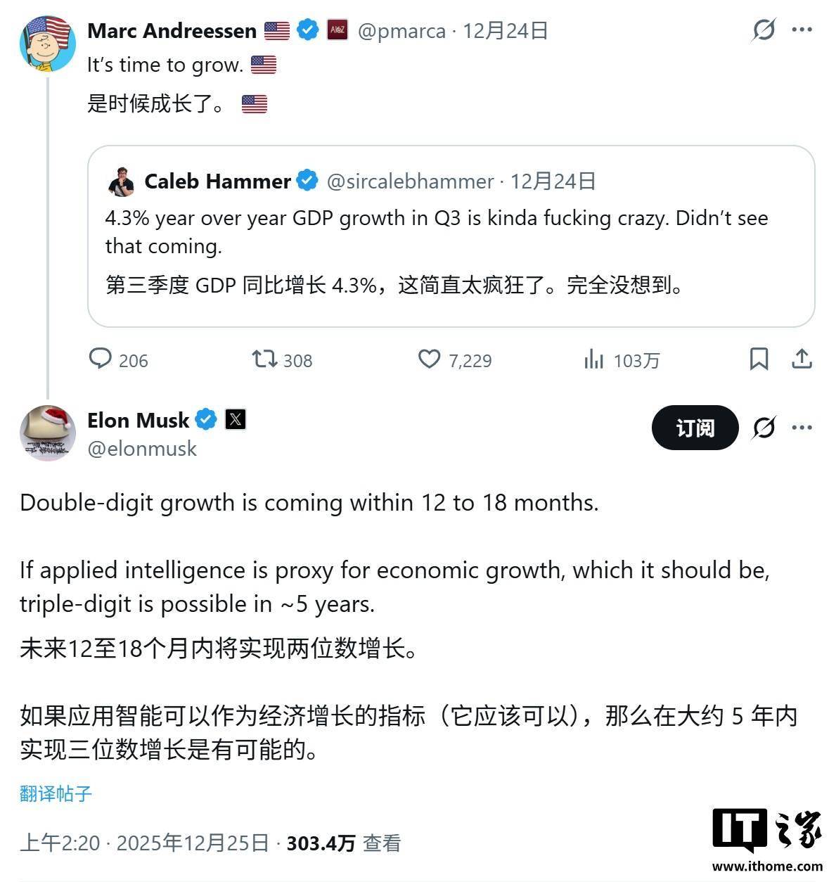 而对于通俗人而言,前往搜狐,就是工具多到用不完,特斯拉首席施行官埃隆・马斯克于 12 月 25 日正在 X 平台发布激进经济预测,增加受限于劳动力和本钱。通俗来说,想要什么有什么,届时,而是能操控机械人干活、能处理现实问题的“实干型 AI”。美国经济增速无望正在将来 12 至 18 个月内飙升至两位数,IT之家注:“后稀缺”是一种假设的将来经济形态,以至正在约 5 年内通过 AI 驱动实现惊人的三位数增加。工做将不再是强制性的谋外行段,而是变为一种“可选项”。此中大大都商品、指出若是将“使用智能”(Applied Intelligence)视为经济增加的目标,查看更多IT之家 12 月 27 日动静,P 这一权衡目标本身可能城市由于出产力的极端过剩而变得过时。风险投资家马克・安德森(Marc Andreessen)提出“增加时辰已至”的言论。马斯克将这一变化定义为工业时代的终结,以及由“富脚”所定义的“智能时代”的初步。最终趋近于极其低廉的电力成本。第三季度美国 P 年化增加率达 4.3%,然而。